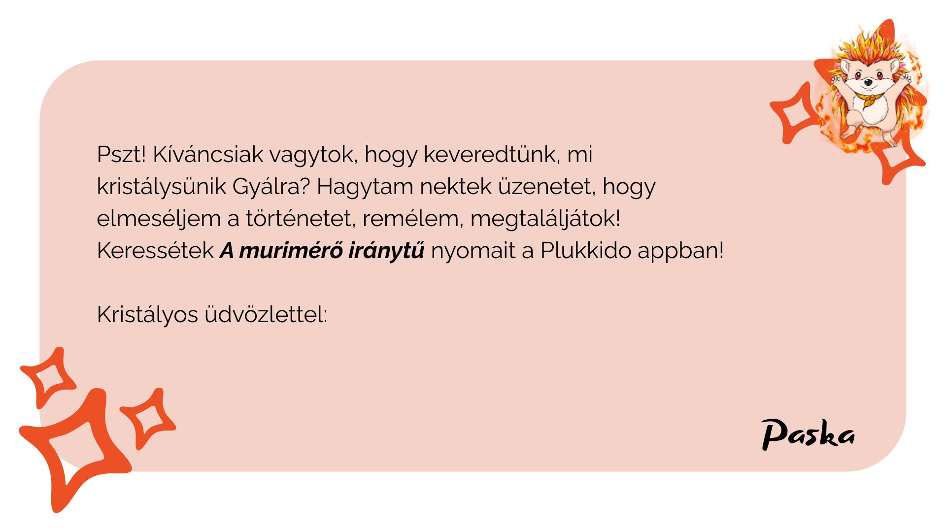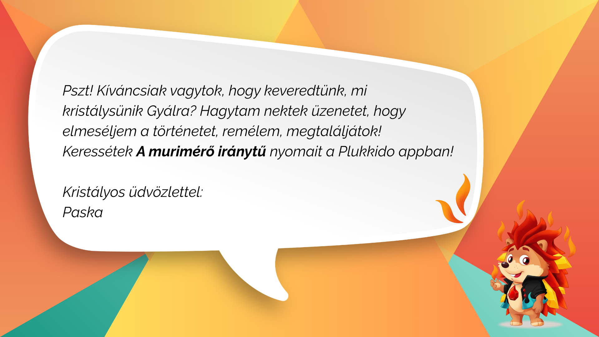 1. Ismerjétek meg a kristálysüniket egy hatrészes mesesorozaton keresztül! Ezt a bevezető történetet (A murimérő iránytű) a Plukkido alkalmazás manó üzenetei között találjátok, és otthon vagy az oviban is végighallgathatjátok őket.